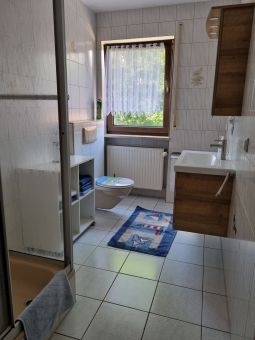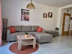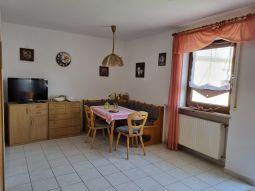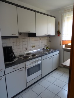 Wohnraum mit Essecke und kompletter Küche; 1 Dreibettzimmer, Dusche/Waschbecken/WC